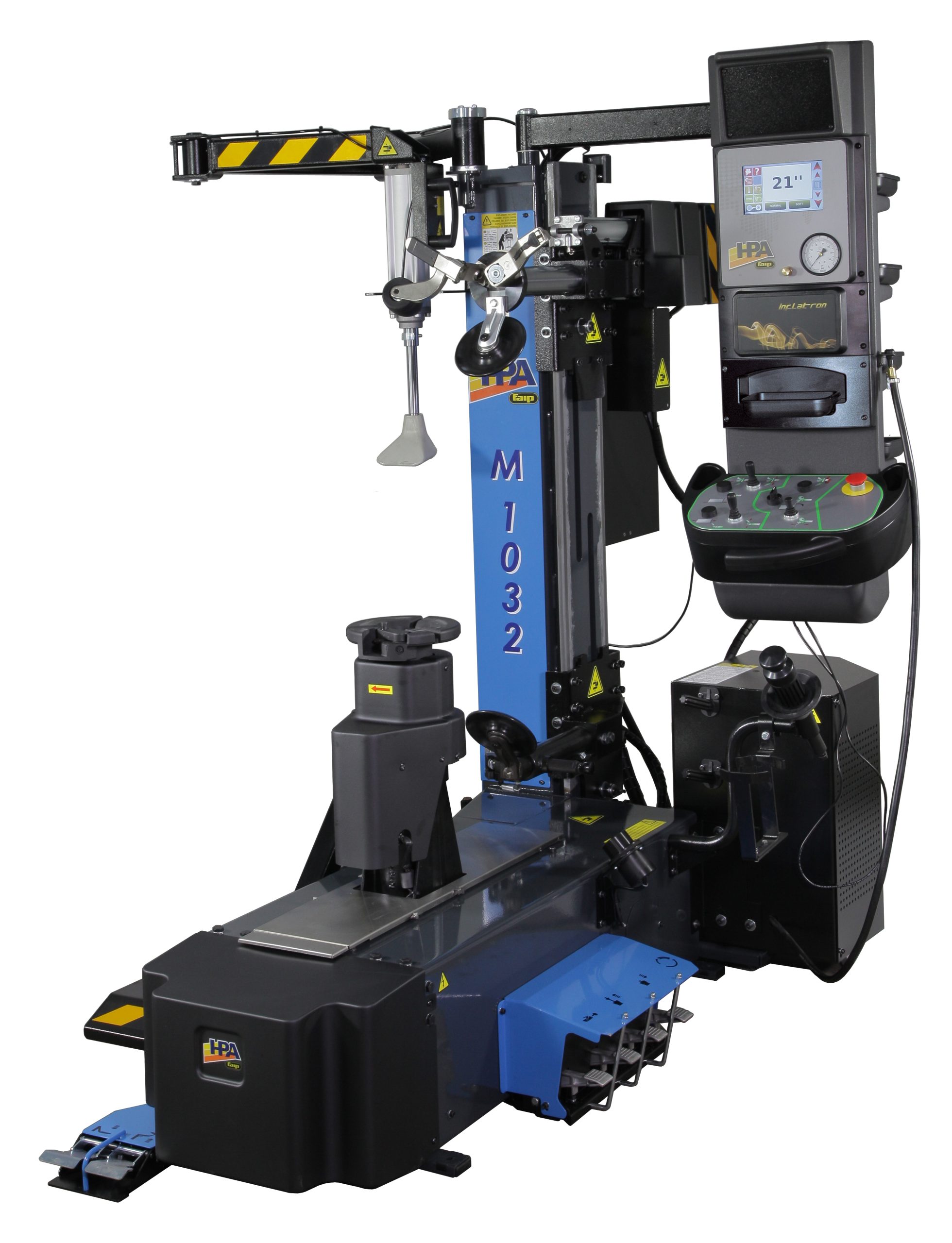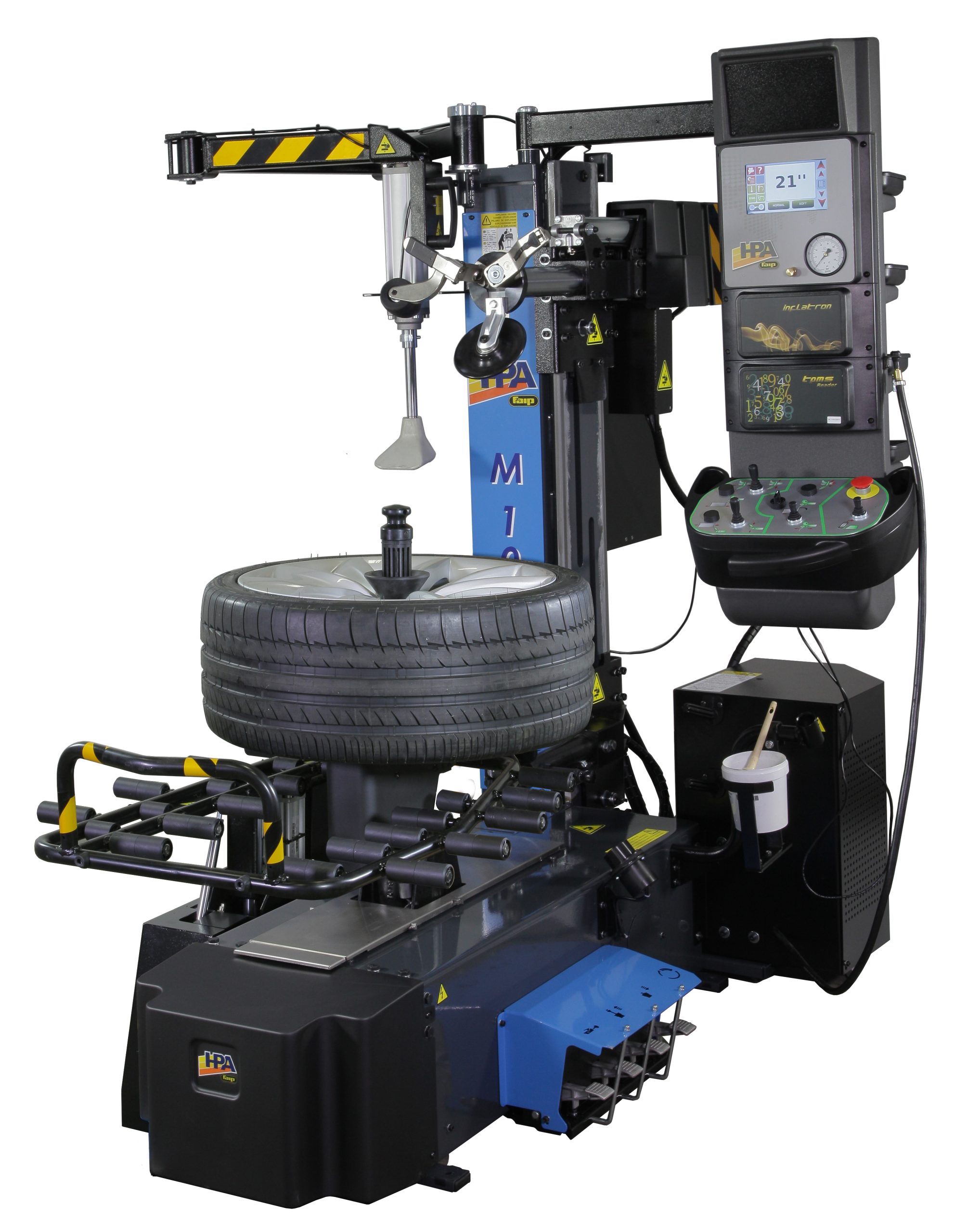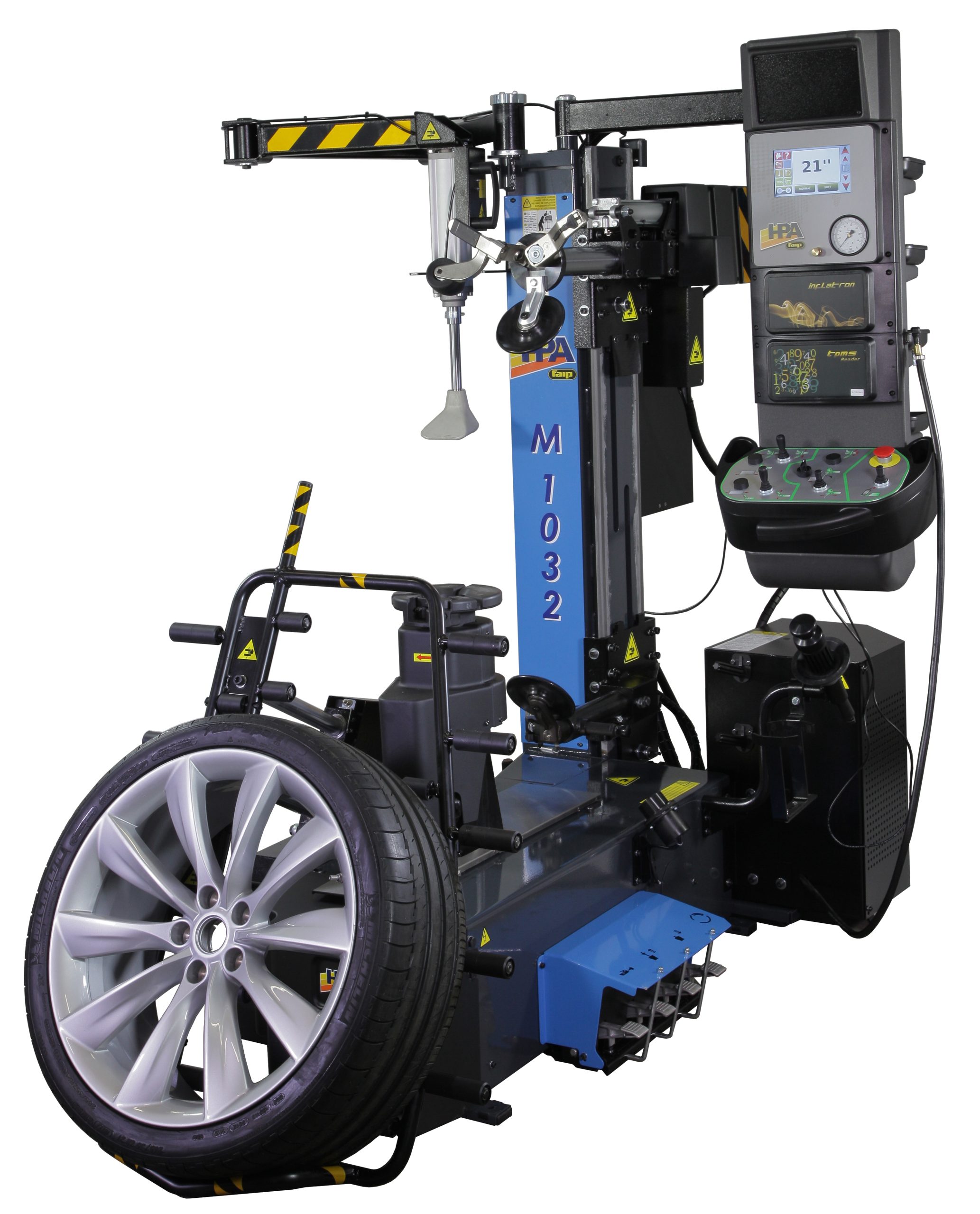 Desmontadora concebida para facilitar al máximo las operaciones de desmontaje y montaje de todos los modelos de neumáticos y en particular de coberturas rigidas, neumáticos rebajados, o súper-rebajados, de nueva concepción cómo UHP o Run flat (marcha plana):