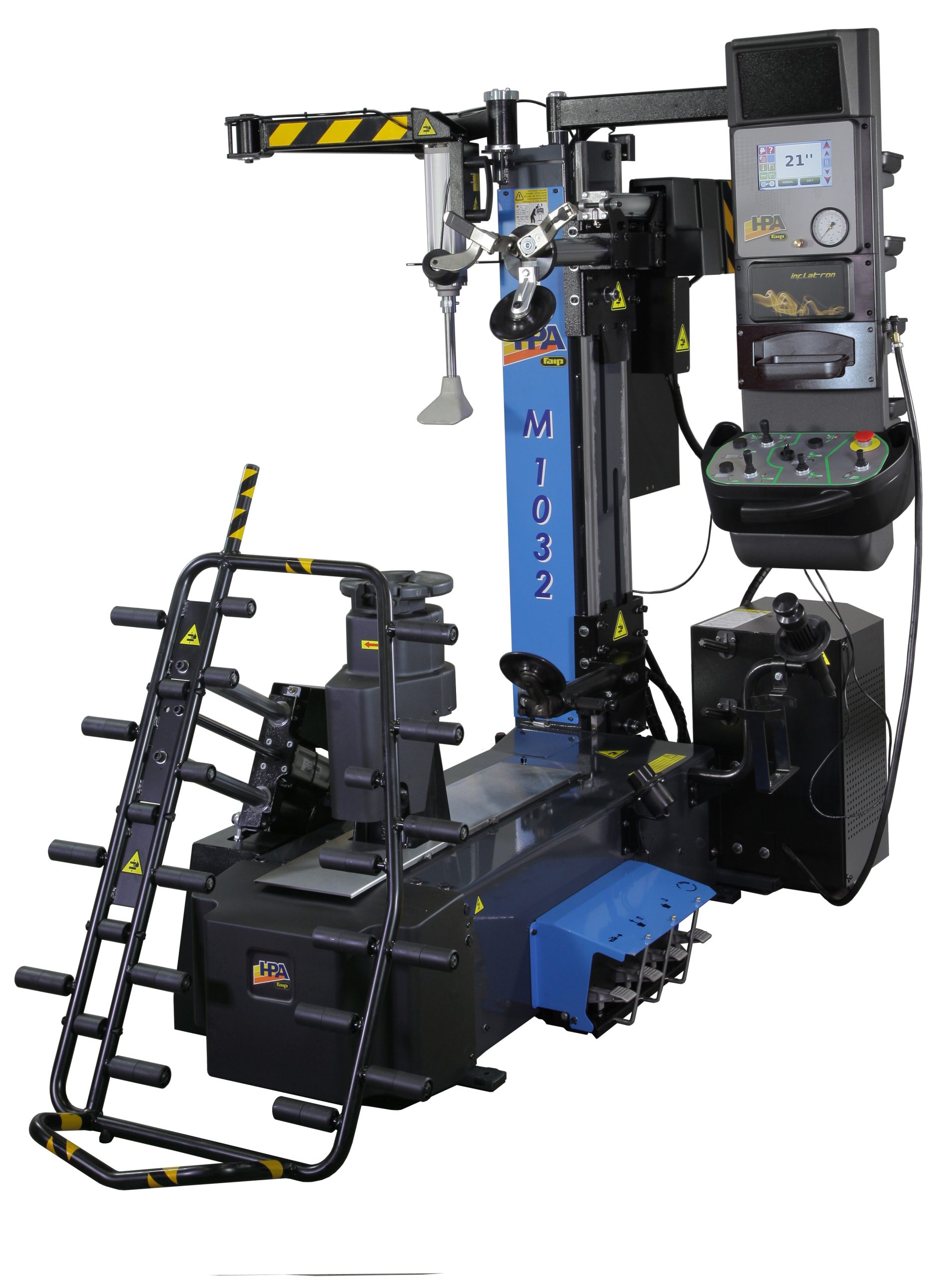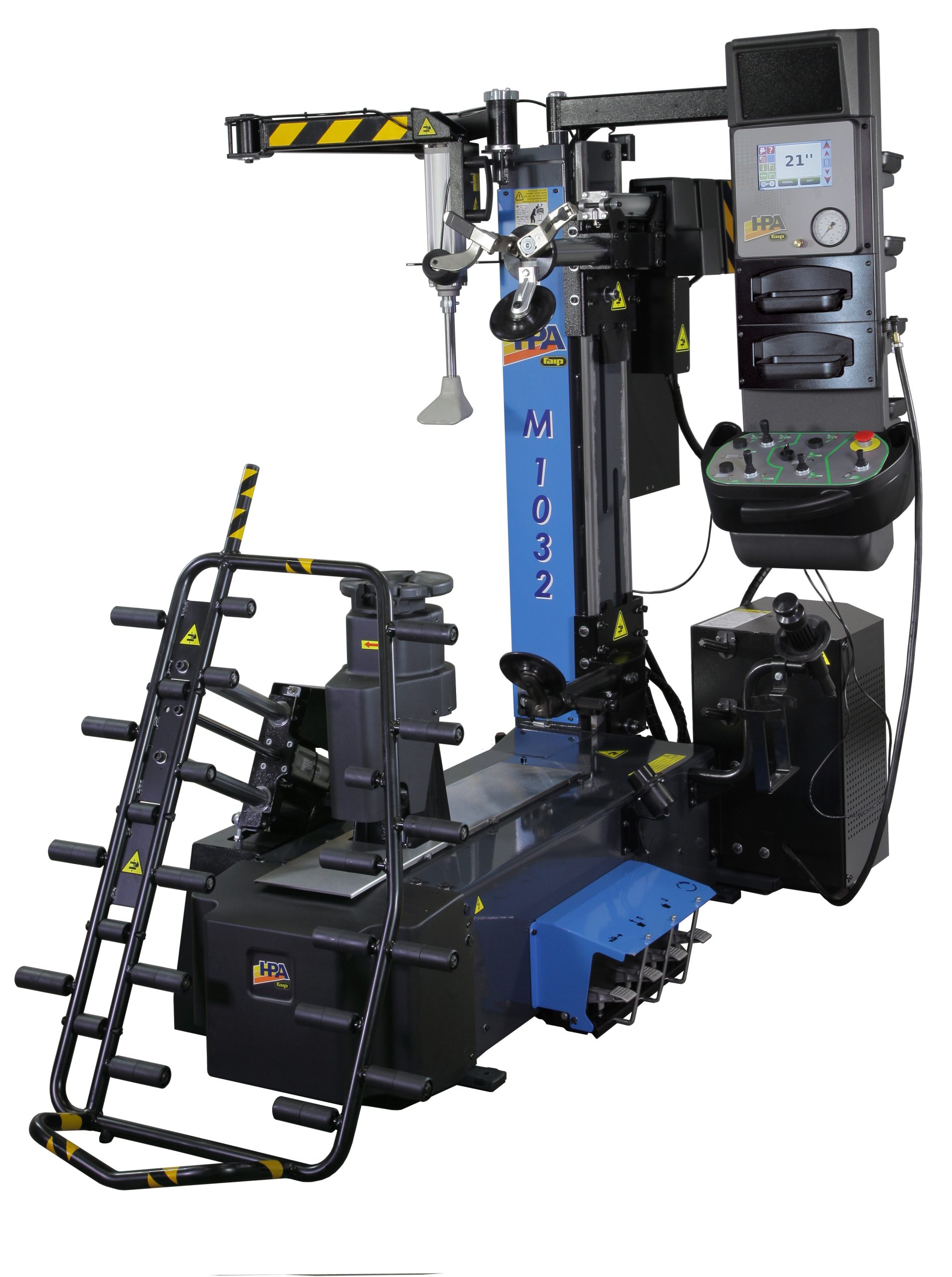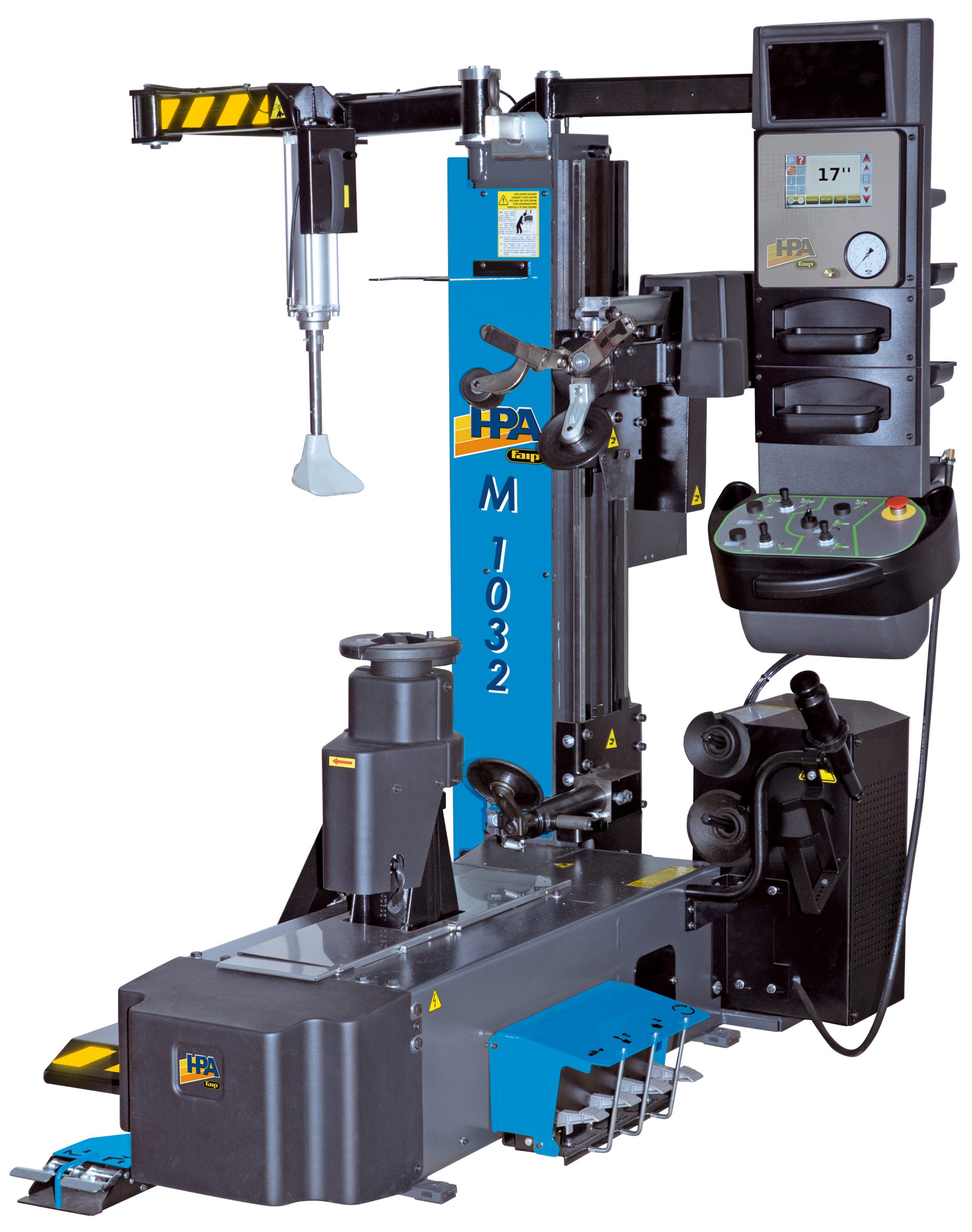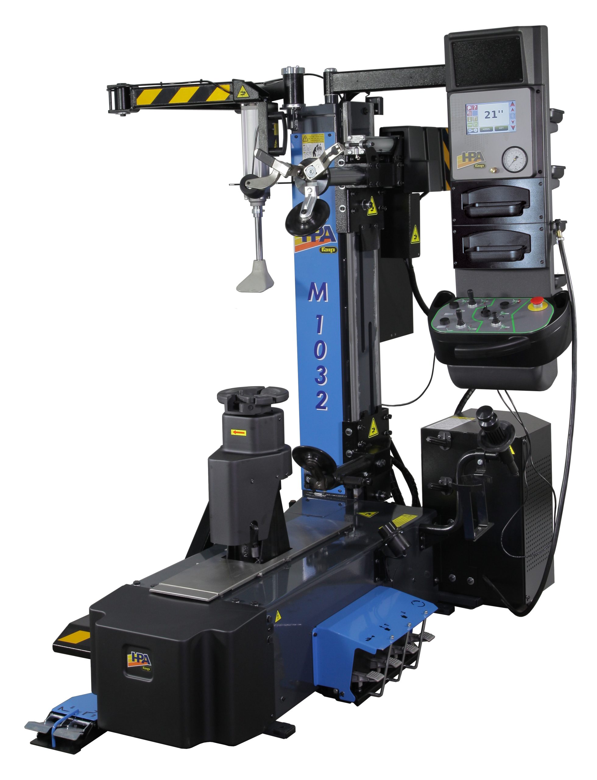 Desmontadora concebida para facilitar al máximo las operaciones de desmontaje y montaje de todos los modelos de neumáticos y en particular de coberturas rigidas, neumáticos rebajados, o súper-rebajados, de nueva concepción cómo UHP o Run flat (marcha plana):